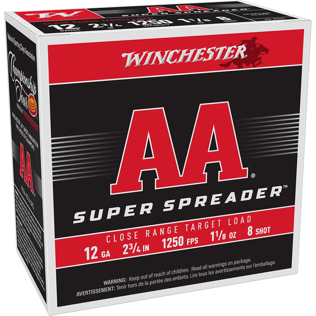 $32.29 You MUST contact us prior to buying ammo shipping to CA, CT, IL, MA, MD, NJ, NY or WA. NO AMMO sale to W.DC. or NYC.Winchester AA Super Spreader Load 12 ga. 2 3/4 in. 1 1/8 oz. 8 Shot 25 rd.