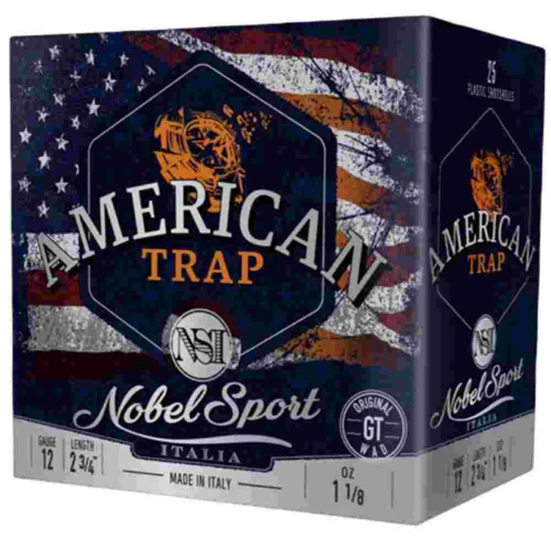 $164.29 You MUST contact us prior to buying ammo shipping to CA, CT, IL, MA, MD, NJ, NY or WA. NO AMMO sale to W.DC. or NYC.Nobel Sport Target American Trap Shotshells 12ga 2-3/4″ 1-1/8oz 1200fps #9 25/ct