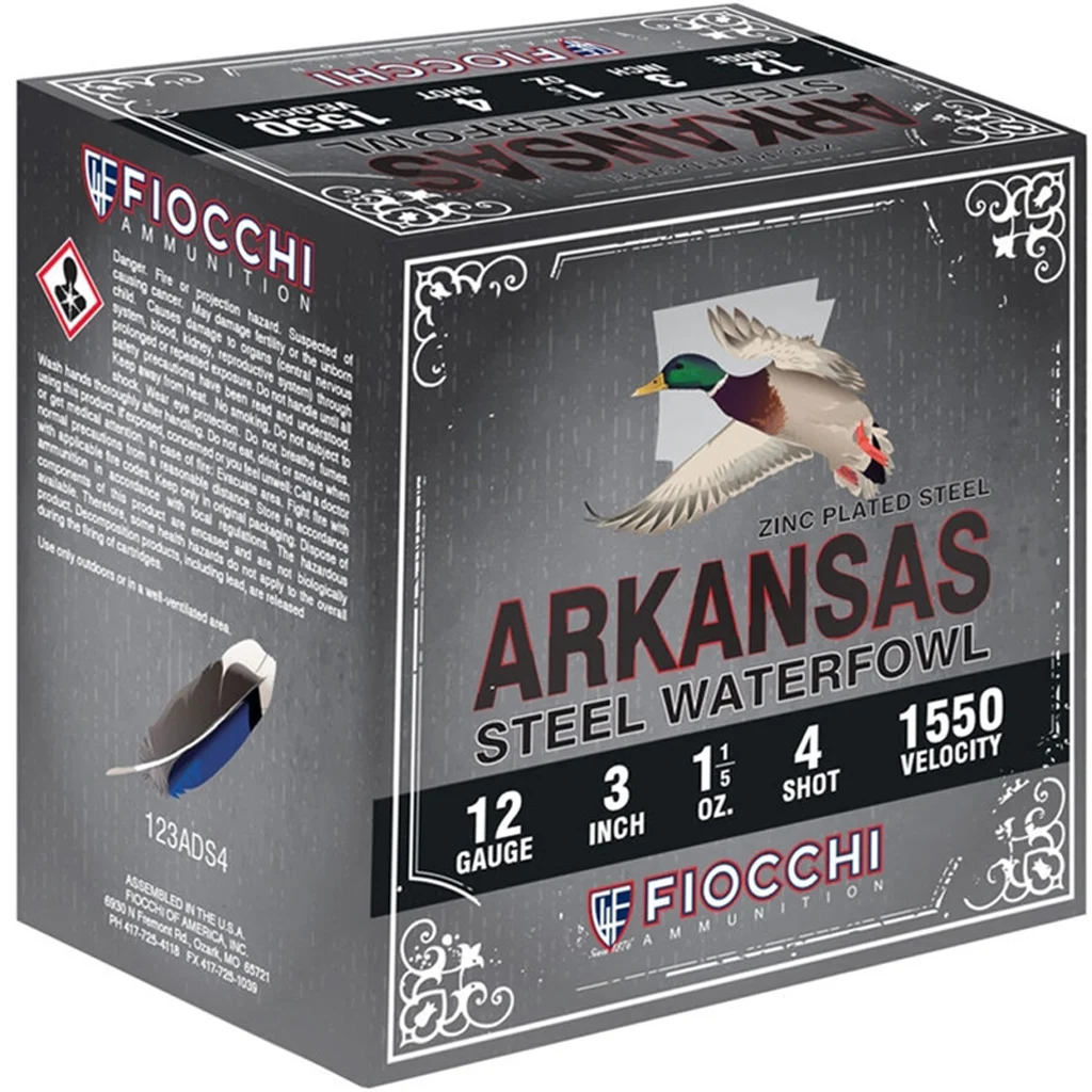 $19.08 You MUST contact us prior to buying ammo shipping to CA, CT, IL, MA, MD, NJ, NY or WA. NO AMMO sale to W.DC. or NYC.Fiocchi Arkansas Steel Shotgun Ammo 12 ga. 3 in. 1 1/5 oz. 1550 FPS 4 Shot 100 rd.