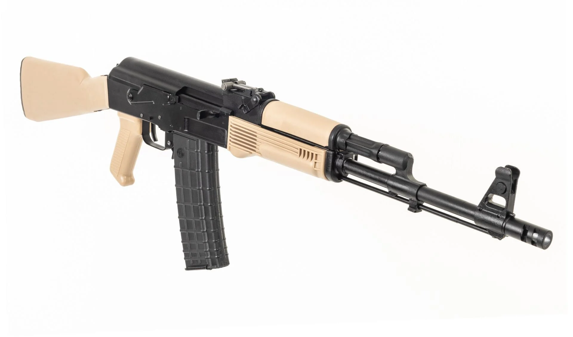 Arsenal SAM5 5.56x45mm (.223 REM) AK47 rifle milled and forged receiver 16.3″ chrome lined hammer forged barrel 14x1mm left-hand muzzle threads AK-351 muzzle brake FIME Enhanced Fire Control Group cleaning rod bayonet lug Desert Sand polymer furniture intermediate length buttstock scope rail comes with one 30 round magazine sling oil bottle and cleaning kit.