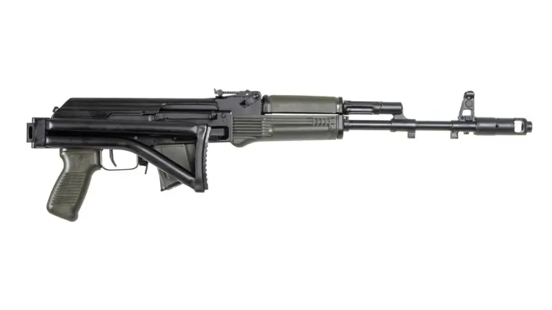 SAM7SF-84EGM | SAM7SF OD Green furniture model 7.62x39mm caliber rifle OD Green 10rd magazine milled and forged receiver enhanced double stage fire control group chrome lined hammer forged barrel 24×1.5mm muzzle right hand threads muzzle brake bayonet and accessory lugs right-side folding tubular buttstock OD Green polymer pistol grip and handguards stainless steel heat shield ambidextrous safety lever scope rail sectional cleaning rod one OD Green 10-round magazine sling oil bottle and cleaning kit.