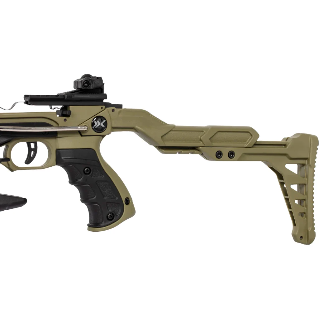 The Desire XLZ Mini Crossbow packs power and precision into a compact, easy-to-handle design. With its break barrel cocking device, loading is quick and effortless, while the adjustable stock extends up to 2.5 inches for improved comfort and control. Equipped with both a premium laser sight and open sights, it ensures accurate, confident shooting every time. Delivering 175 FPS with a 60-pound draw weight, the Desire XLZ includes three premium bolts, making it ideal for backyard shooting and target practice.