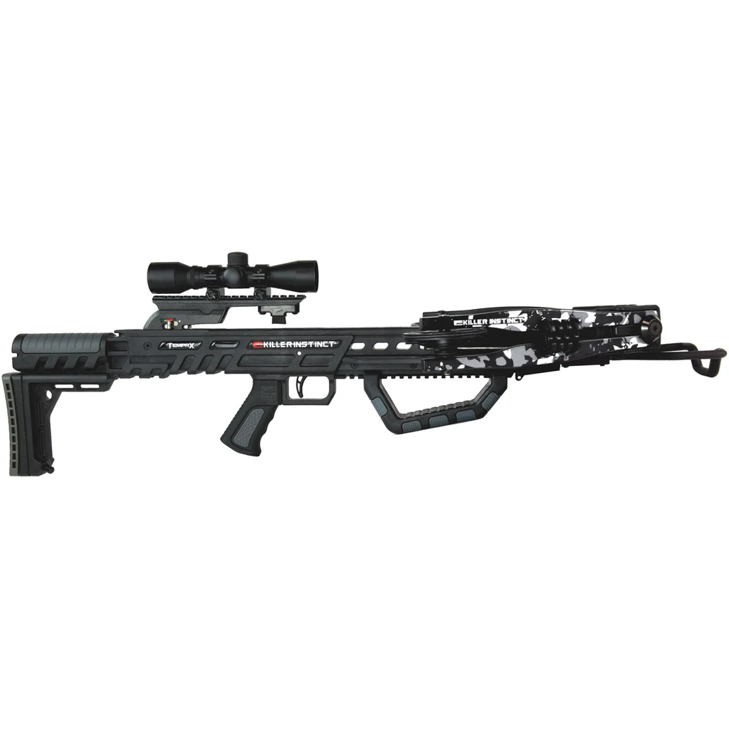 The Killer Instinct Tempr-X Crossbow Kit is built for tight-quarters maneuverability and high performance, featuring a patented synchronized X-Cam system for smoother, quieter shots with 56 percent let-off. Measuring just 6.75 inches cocked and 10.375 inches uncocked, it excels in compact environments. The stock includes molded rubber touchpoints for added comfort in colder weather. This crossbow delivers speeds up to 405 FPS and 134.78 ft-lb of kinetic energy with a 195 lb draw weight and 13.5-inch power stroke. The kit includes two 20-inch 390 gr Hypr bolts with V-Track nocks, a Lumix 4×32 scope, and a rope sled cocker—everything needed to get started.