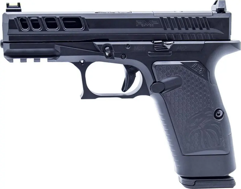 The AMPX is the evolution of the AMP. A longer grip taking a standard Glock® 17 magazine. This Aluminum Match-Grade Pistol was designed by a team of engineers competitive shooters and law enforcement with the purpose of developing the ultimate mission ready pistol that they would depend their own life on. The Fire Control Unit is precision CNC machined out of heat-treated 17-4 Stainless Steel. This design allows for the rails to be machined perfectly flat to each other and held to a .0005 specification to reduce any unnecessary play seen in many traditional firearms. The AMP’s aluminum milled frame reduces flex and recoil while shooting. The skeletonized 1911-angled grip frame allows for custom and aftermarket grip panels to modify for an intuitive and reliable grip. The frame features an extended beavertail that allows the pistol to sit lower and more comfortably in the shooter’s hand for better recoil control and improved accuracy. The trigger barrel slide sights and most internals are Glock® compatible. The AMP slide is machined with stepped quad windows and deeper serrations on the slide to enhance grip reduce weight and improve cycling speed. The slide comes standard with an RMR optic cut to directly mount a sight without cumbersome plates or adapters. The match-grade nitrided fluted barrel is honed burnished to an 8-micron finish and rifle cut for unparalleled accuracy. Whether it be giving you the next competitive edge on the field or the security you need for home defense. The AMP (Aluminum Match-Grade Pistol) is ready for any mission.