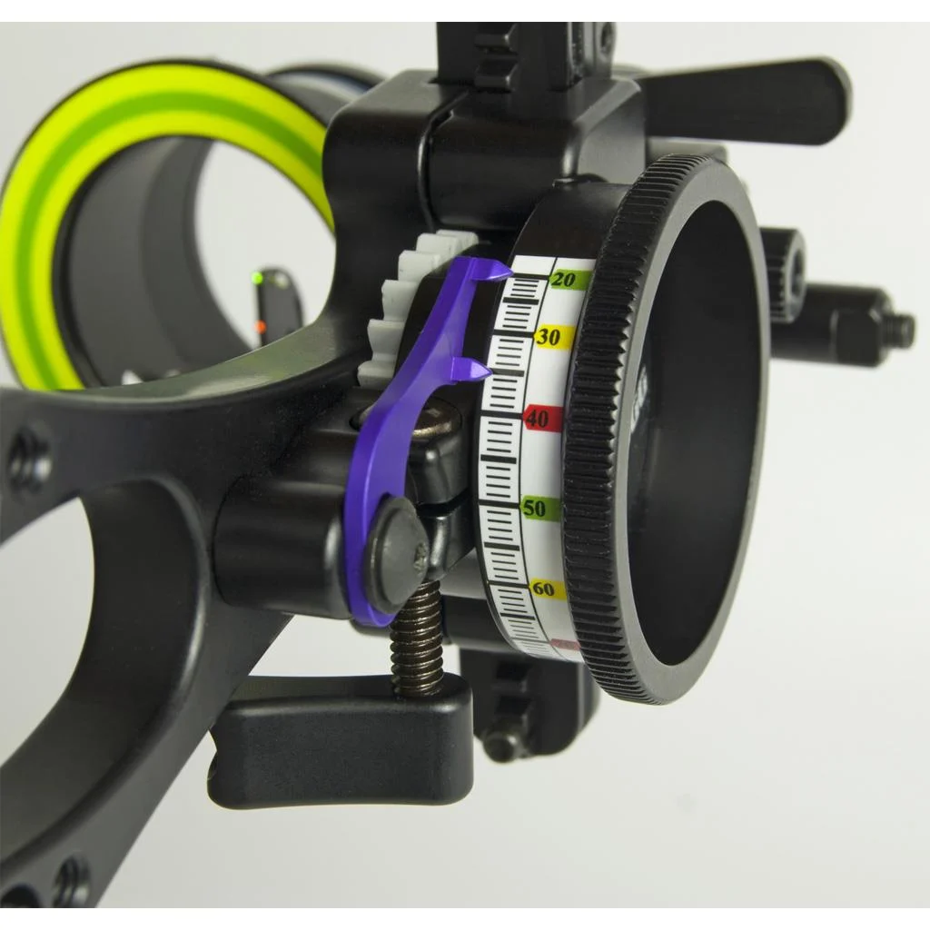 Adjustable sight that borrows features from the Hogg Father sight, but in a much lighter and sleeker package. Features a rigid yet lightweight dovetail mount, micro-adjust 2nd and 3rd axis, and tool-less horizontal and vertical adjustments. Uses a silent, quick release locking yardage knob and click free yardage adjustment wheel. Made from 6061 aluminum. **NO California PROP-65 Warning Label**