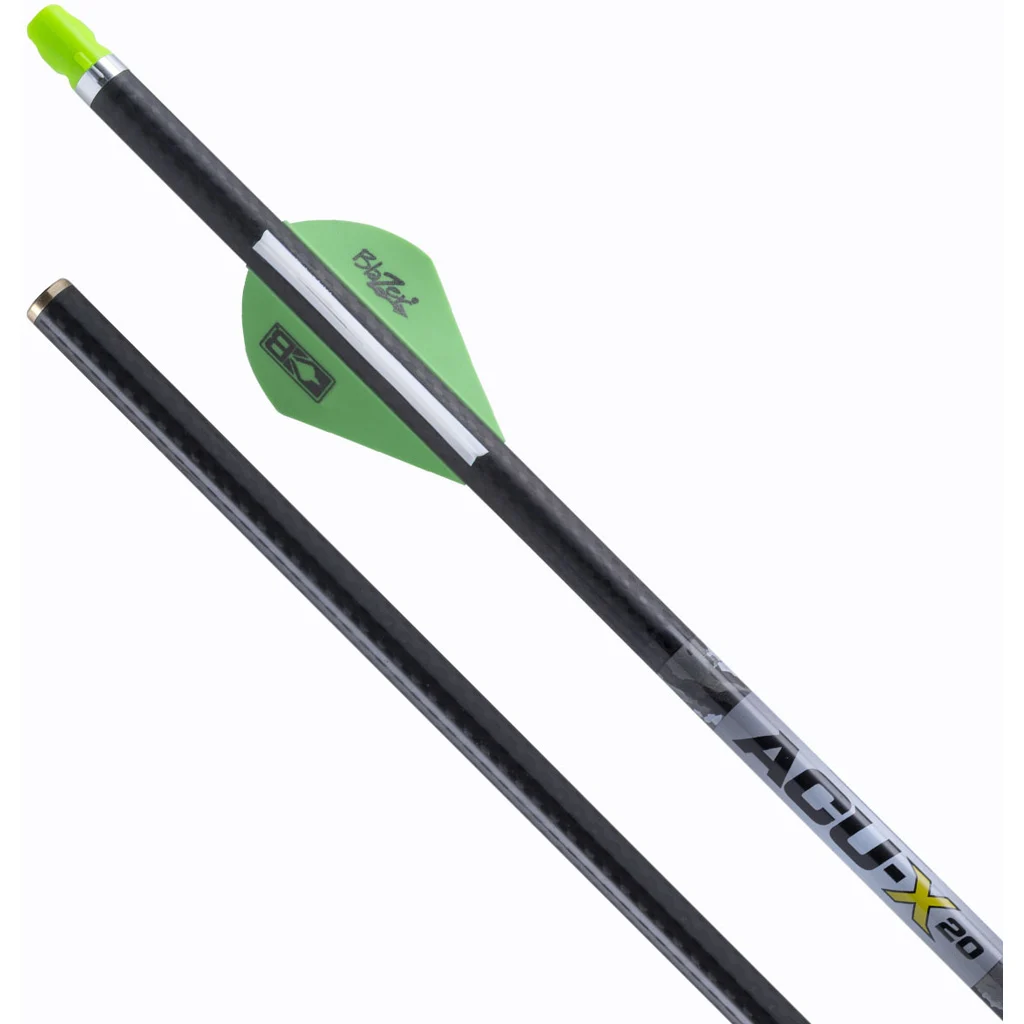 The ACU-X 20 is a 20-inch, 440-grain crossbow arrow built with a high-performance carbon shaft and a precision spine-indexing process for consistent long-range accuracy in rail-less forward-draw crossbows. It uses a Snap-On nock that provides an audible click when engaged and is designed to reduce lateral nock travel while helping preserve center serving life. Each arrow is fletched with 2-inch Blazer vanes and includes a 92-grain insert, delivering a 16.5 percent FOC. Arrows are inspected to 0.001-inch straightness and weight matched within 1 grain per arrow.