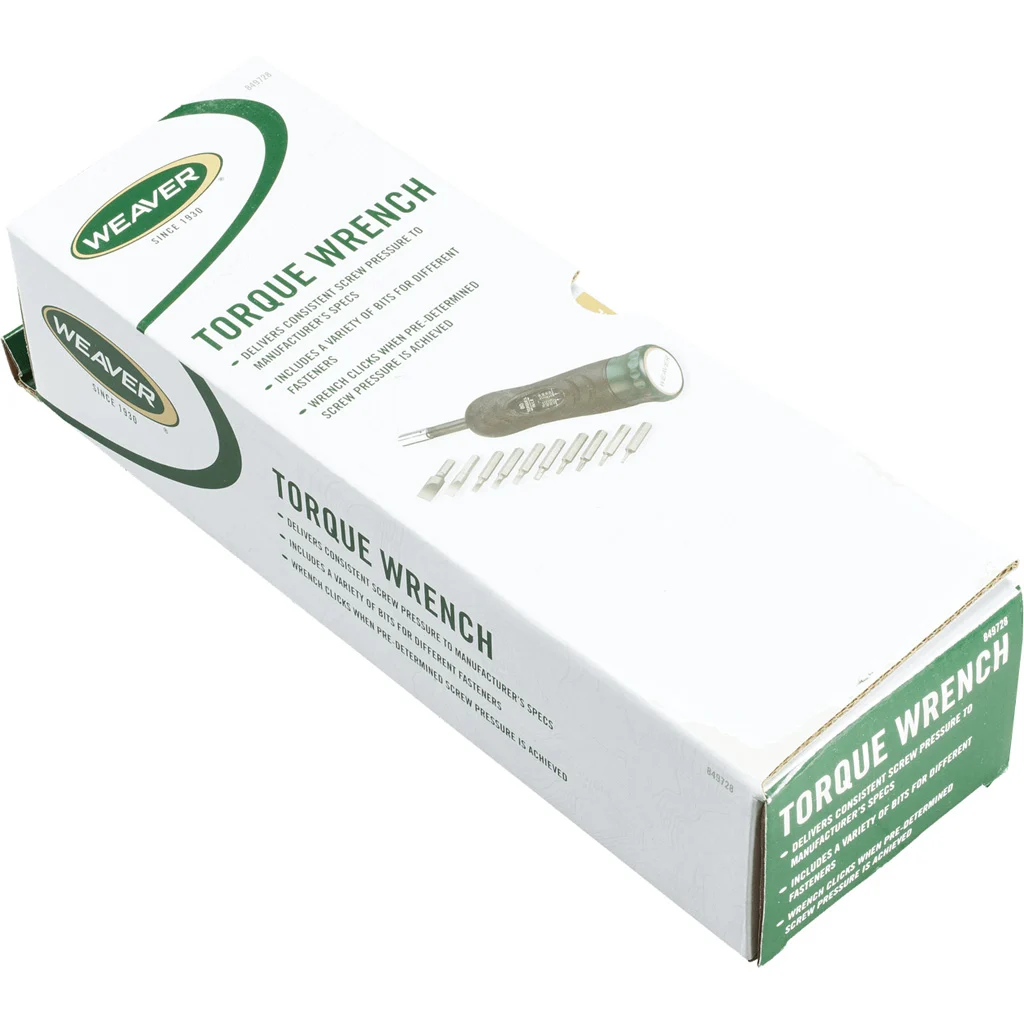 The Weaver Gunsmithing Torque Wrench is a compact and reliable tool designed to ensure precise screw tension during scope mounting and other gunsmithing tasks. Featuring a variety of magnetized bit tips for different fastener sizes, this torque wrench allows for quick, accurate adjustments without over-tightening. It includes a solid hand grip for enhanced control and comes packaged in a durable, rugged case. Ideal for professional gunsmiths and DIY firearm enthusiasts alike.